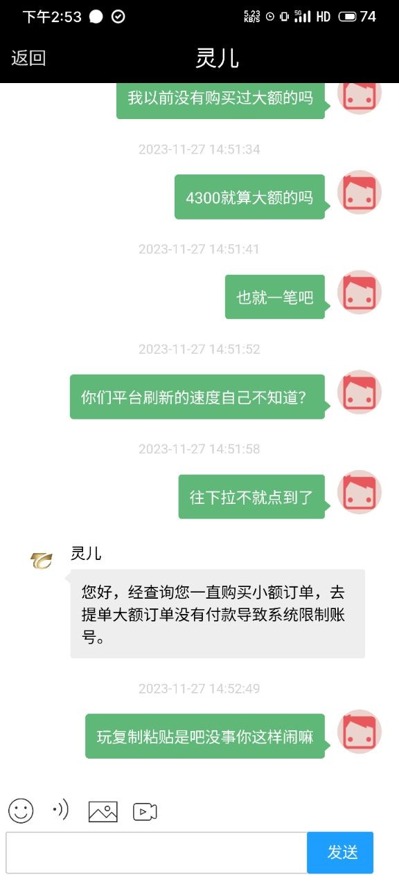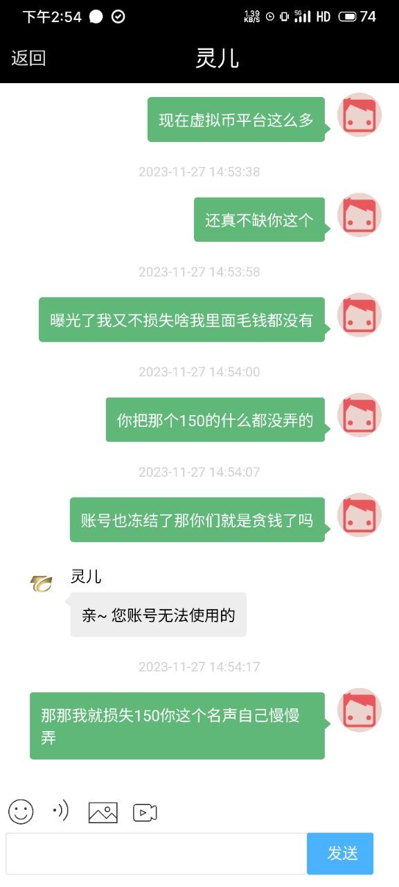 吞钱就光明正大的吞,就要像他这样,不知道什么时候开始啊?一群人跟个孙子一样用用他们钱包,低个头就能好,为什么要低头呢?是我们玩家呀,他应该给我们低头吧,几百块钱送狗了,这种虚拟钱包,到最后都要跑路的,到时候割得更狠,两个毫无关联的账号,因为在同一部手机登录了,所以直接冻结,就因为抢了一个4300的单没付款,然后我及时取消了,两个账号,一个还有余额,一个没余额,屌了他几句,直接复制粘贴回复