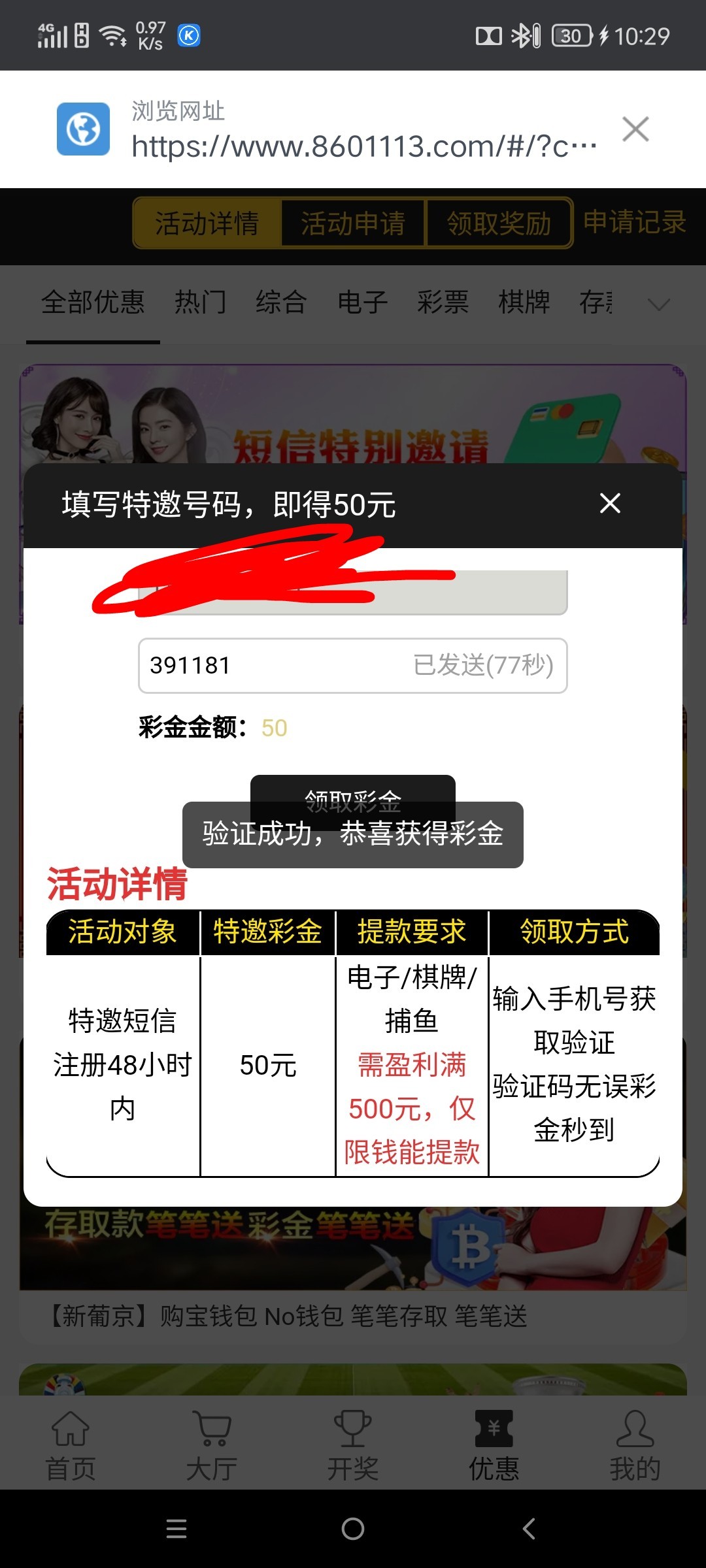 自助特邀,注册绑卡下载APP送27,优惠,输入手机号,自助申请特邀彩金50,满500提现,秒到账,亲测!