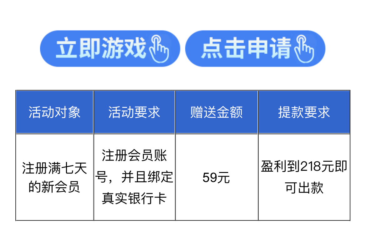 新用户注册绑卡完善资料,然后满七天领取59彩金,勿充值