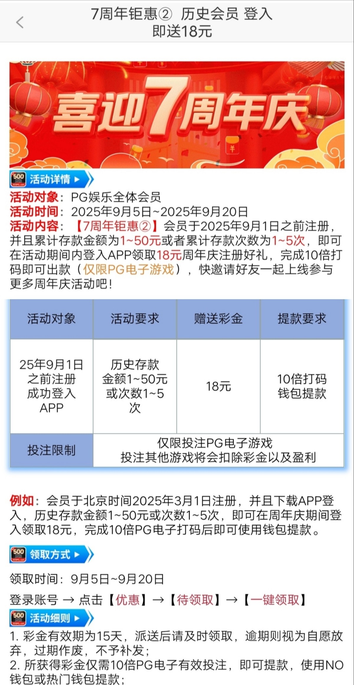 会员于2025年9月1日之前注册,并且累计存款金额为1~50元或者累计存款次数为1~5次,即可在活动期间内登入APP领取18元周年庆注册好礼,完成10倍打码即可出款(仅限PG电子游戏