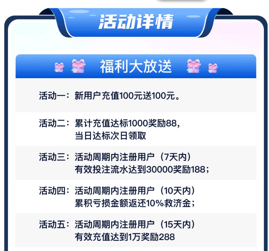 新玩家周期内充值满 1000 流水 5000 以上反588元, 只有注册的对应周期存款才有,必须充值3天以上,要官方平台过审的,可查验,多充多娱乐更容易达标,返现活动达标拿588元,官方没过审的补偿彩金88元,为了避免多iP不要开加速器。