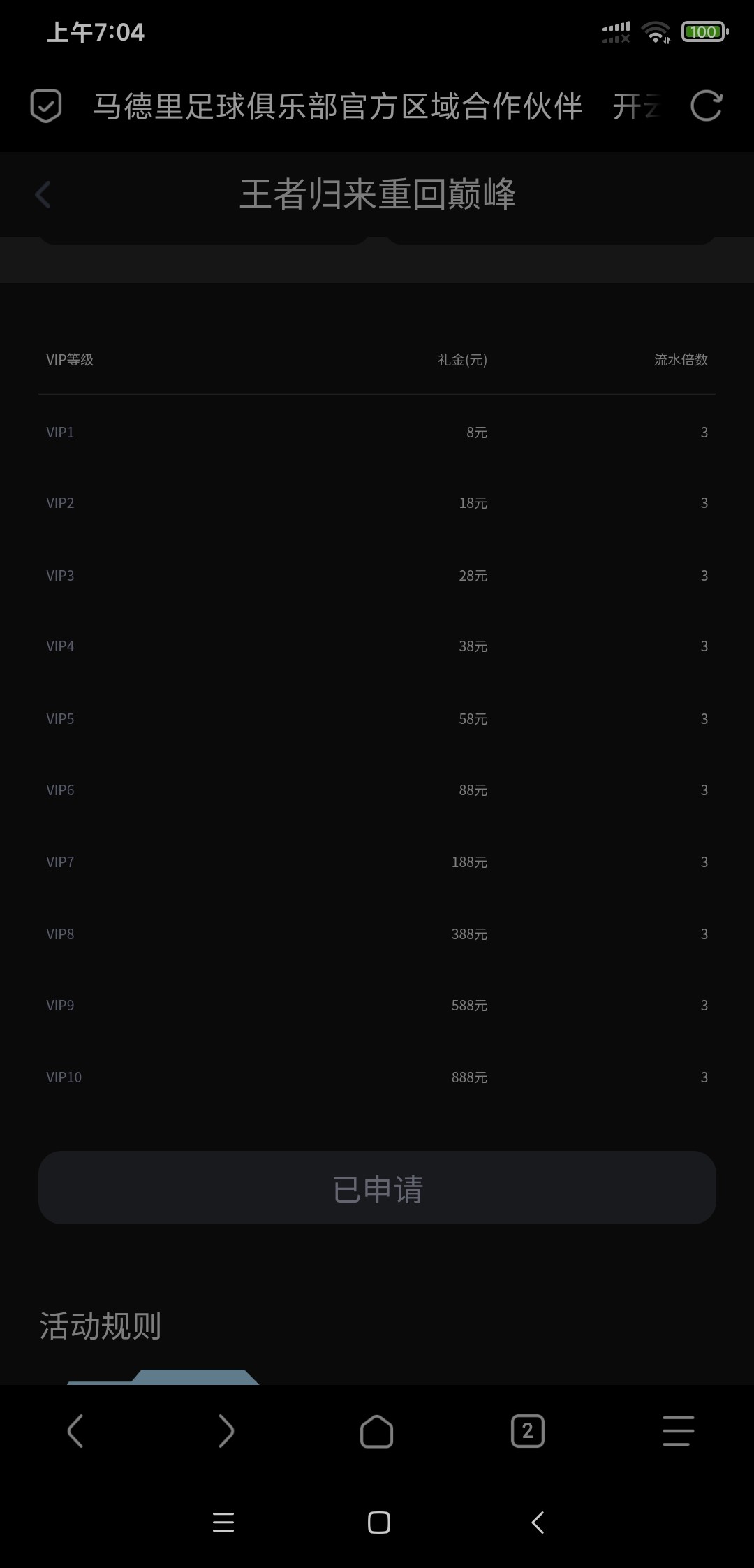 需要v1,活动里王者回归。不能彩票。
