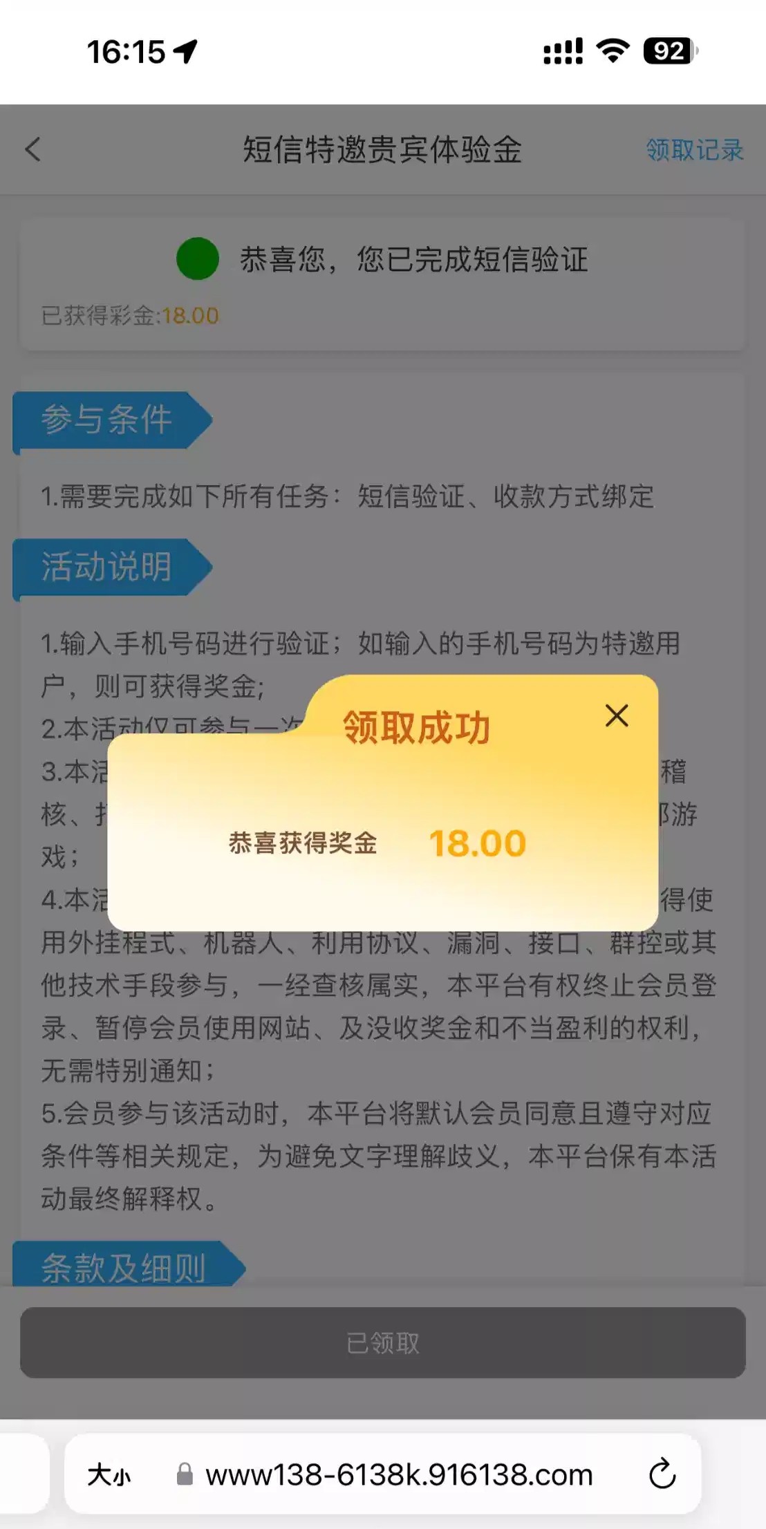 接到电话然后去短信验证18彩金,黑不黑不知道我没打出来,可以去碰瓷一下wgxl.cc