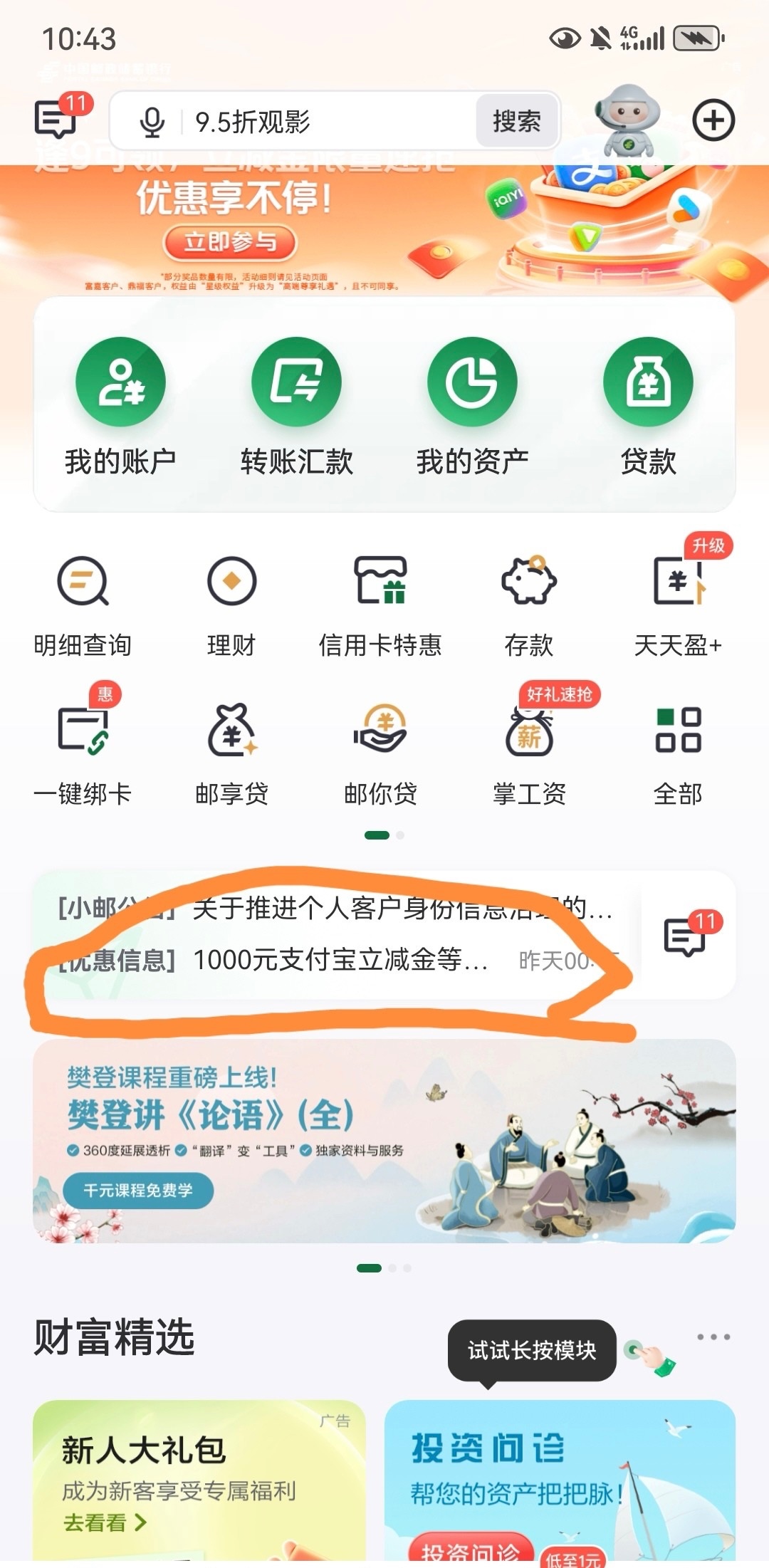 登录邮储APP,首页,找到标记活动,一分钟即可完成1—1000立减金,看运气,别喷,还有我的—生活权益,月月有礼