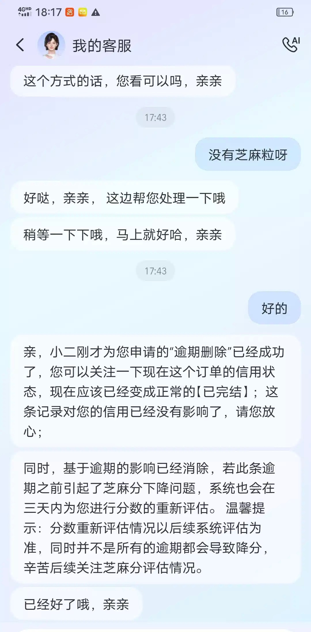 我以前也有个来分期一直卡住芝麻分,之前掉到四百来分,后面不知道莫名的恢复到580,然后也是按照这个方法把逾期取消了,分恢复到606,可是里面的借呗花呗什么的还是一个都不能用,现在的芝麻分没啥含金量了