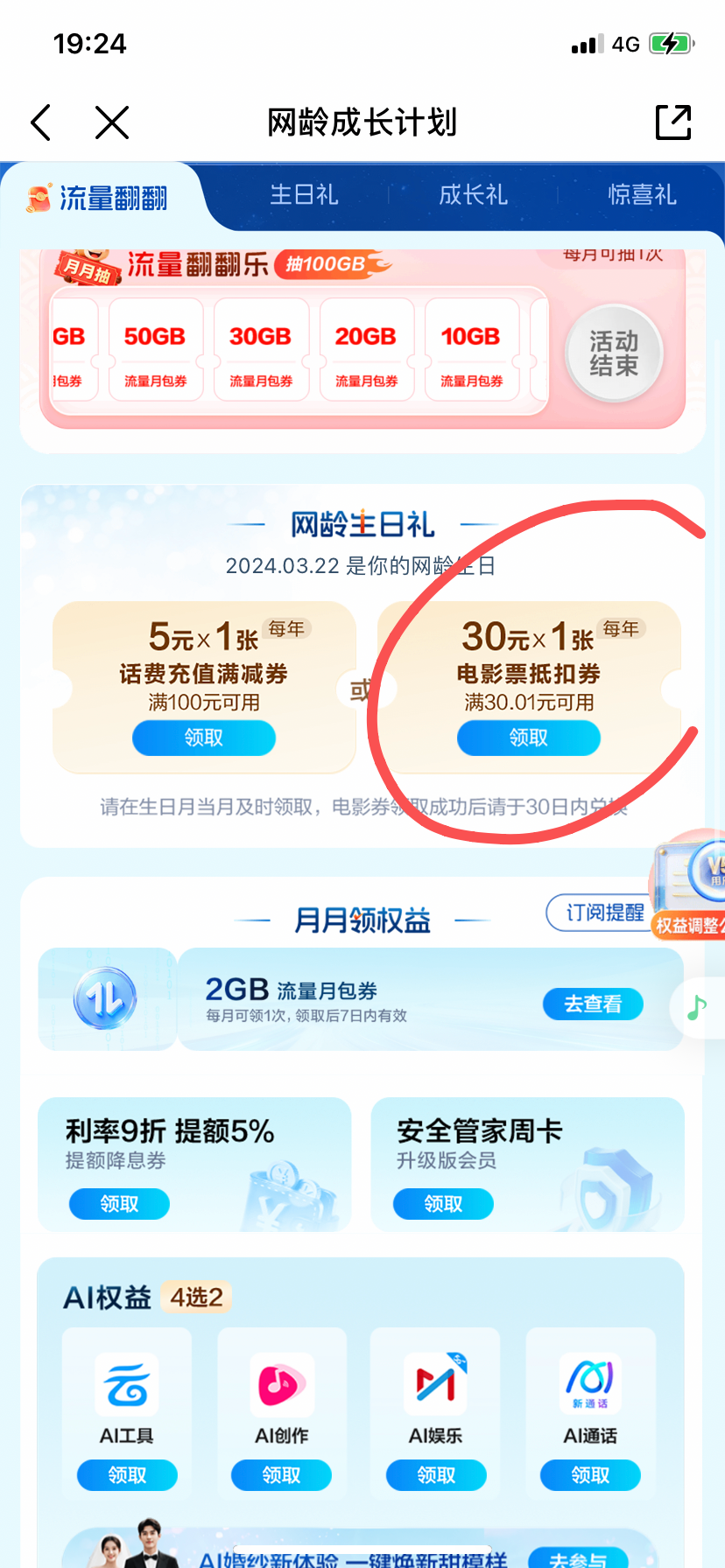 中国移动app,网龄成长计划,领这个30电影票, ,咸鱼秒卖