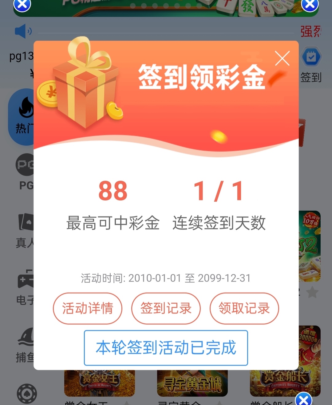 新老用户每天去首页签到秒8-88彩金,具体自测吧每天一次切记勿充值勿充值